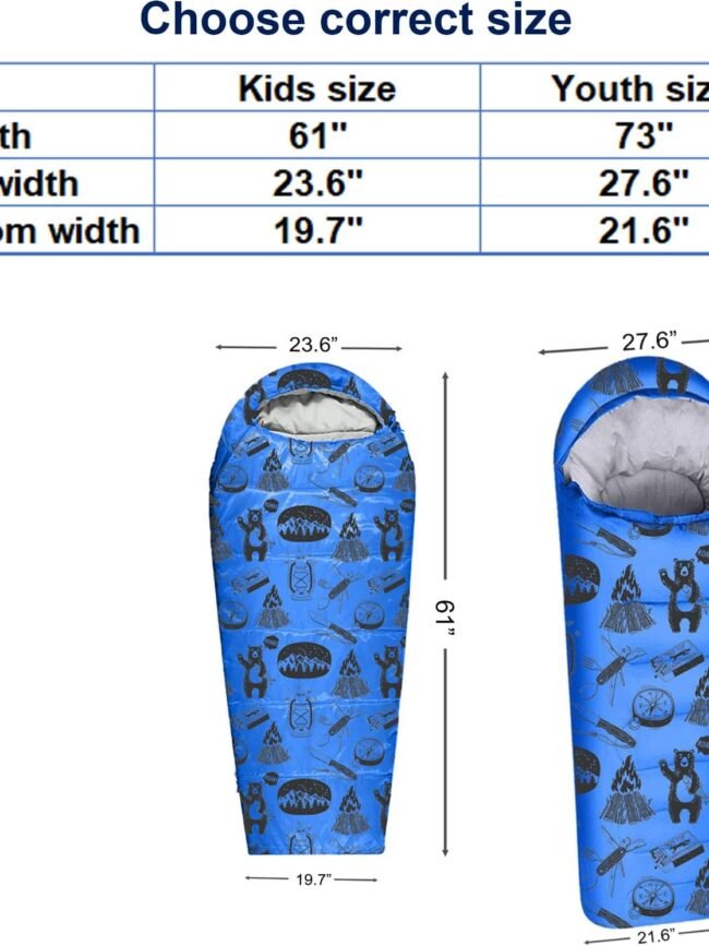 - Size: kids sleeping bag measures 70 x 28 x 22 inches with a wide-top and narrow-bottom design, providing excellent warmth and ease of use. It is specially designed for children aged 4-12 years and teenagers under 5'3" tall