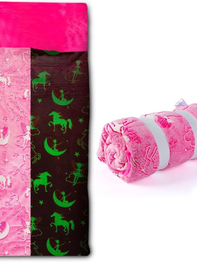 - MULTIFUNCTIONAL FOR PLAY, CUDDLES OR SECURITY The pink girly fleece blanket is great to snuggle up with while watching movies and reading books, serves as a great place to play on, or is perfect for sleeping with at night. The unicorns and fairies in this plush slumber mat will glow green at night after being placed by a light source. For best results, place blanket near a direct light source for at least a half hour. See description for list of best light sources.