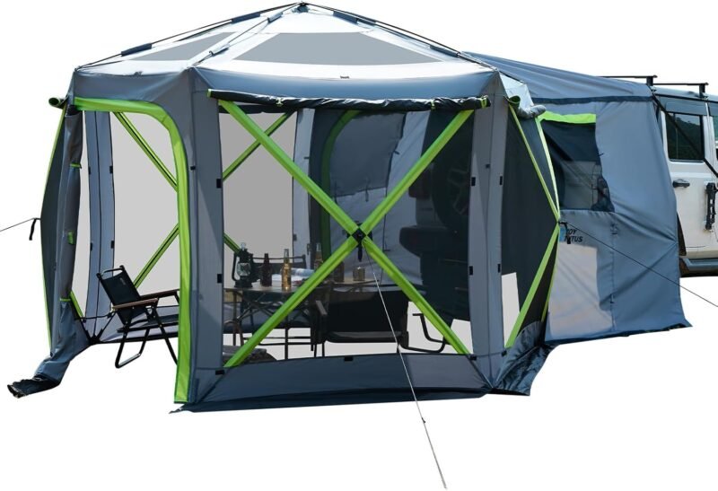 • Waterproof & Strong Stability: Our SUV camping tent made of 210D Oxford cloth plus waterproof rainfly. The car tent features 2 doorways with 2 sides door struts, 4 sides, and roof support poles. The pole is made of a 12 mm fiberglass, so that has strong support. With six adjustable wind ropes plus 2 extras, and 14 ground nails plus 2 additional, concealed beneath the gazebo skirt’s cover cloth, stability is enhanced throughout